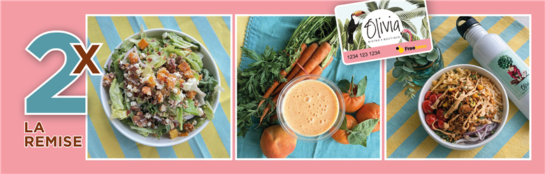 En mars, obtenez 2X la remise Freebees sur nos produits en vedette dans nos succursales Olivia! La Salade bûcheronne, le bol nachos et le smoothie orange sunset!